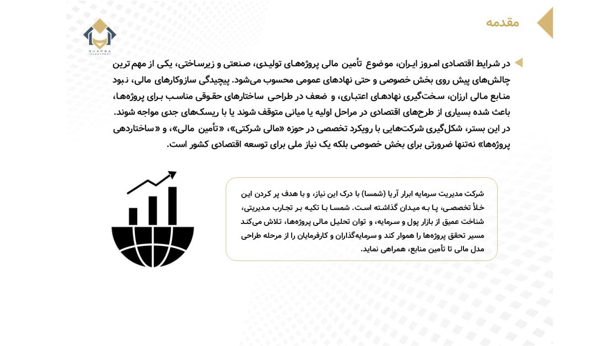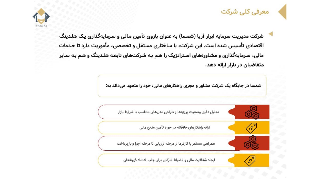 شرکت مدیریت سرمایه ابرار آریا (شمسا) با درک این نیاز، و با هدف پر کردن این خلأ تخصصی، پا به میدان گذاشته است. شمسا با تکیه بر تجارب مدیریتی، شناخت عمیق از بازار پول و سرمایه، و توان تحلیل مالی پروژهها، تلاش میکند مسیر تحقق پروژهها را هموار کند و سرمایهگذاران و کارفرمایان را از مرحله طراحی مدل مالی تا تأمین منابع، همراهی نماید.